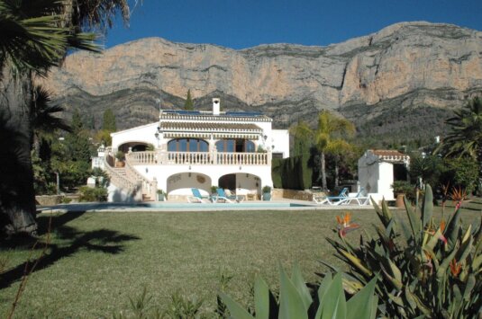 Freistehende Villa im spanischen Stil eingerichtet in wunderschöner Lage in Javea am Fuße des Montgò mit Panoramablick. Es gibt insgesamt 4 Terrassen mit Sonne und Schatten und einen schönen und sehr gepflegten grünen Garten mit großem Privatpool 10 x 5m, der in Tosca Naturstein eingebettet ist. Sonnenliegen befinden sich auf der großen Terrasse am Pool. Dieser besondere Stein wird im Sommer nicht heiß und ist rutschfest. Auch eine Aussendusche mit warmen und kaltem Wasser gibt es am Pool.